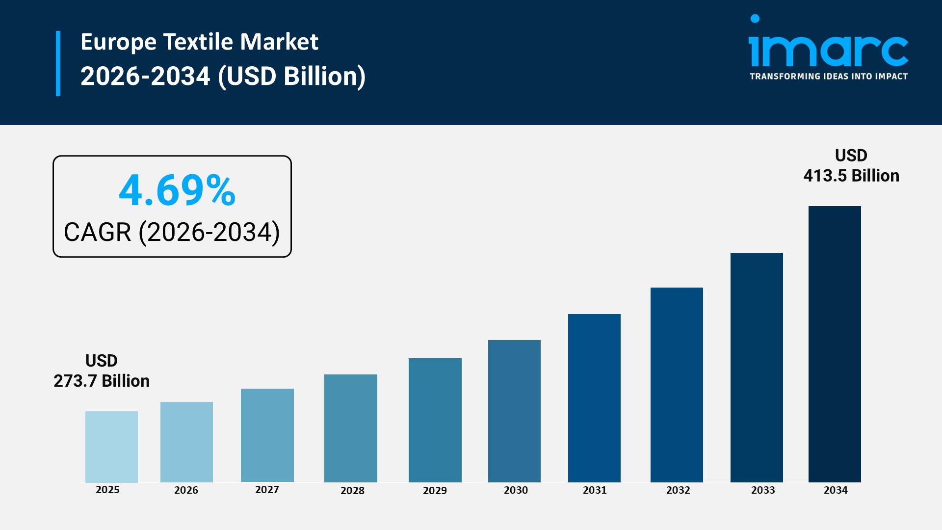 LONDON, LONDON, UNITED KINGDOM, February 27, 2026 /EINPresswire.com/ -- The Europe Textile Market is experiencing steady structural transformation driven by sustainability mandates, technical textile innovation, reshoring strategies, and digital supply chain modernization. The market is valued at approximately USD 273.7 Billion in 2025 and is projected to reach USD 413.5 Billion by 2034, expanding at a CAGR of 4.69% during 2026–2034. While growth remains moderate compared to emerging economies, Europe’s textile sector is distinguished by high-value production, regulatory leadership in sustainability, and advanced manufacturing integration.Request for a sample to get detailed understanding about the market: